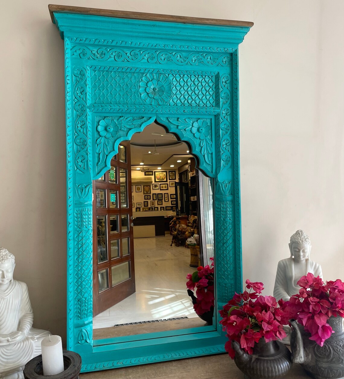At first, hand carved wooden wall Jharokha mirror is a perfect blend of traditional craftsmanship and vintage charm, making it an exquisite decor piece for your home. Inspired by Rajasthani architecture, this ornate mirror frame features intricate carvings, arched designs, and a heritage aesthetic that adds a regal touch to any wall. However, Whether placed in the entryway, living room, bedroom, or hallway, a Jharokha-style mirror enhances the space with depth, elegance, and artistic appeal.