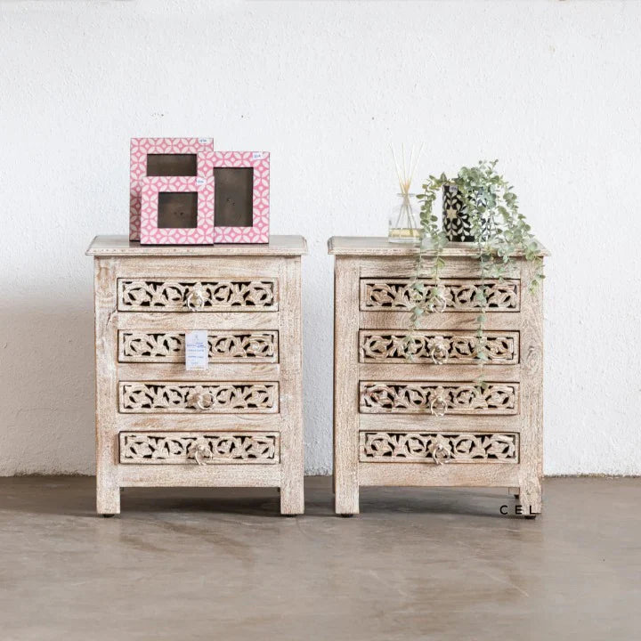 hand carved bedside table, mango wood bedside table, distressed bedside table, nightstand, 4 drawer bedside table, scroll carved bedside table, openwork bedside table, indian carved furniture, bedroom bedside table, bedroom nightstand, bedside storage, compact bedside table, handmade bedside table, artisan made nightstand, premium wood bedside table, quality wood furniture, durable nightstand, sturdy bedside table, timeless nightstand, elegant bedside table, heirloom nightstand, coastal bedside table, shabb