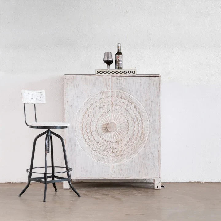 Hand‑Carved Solid Mango Wood Bar Cabinet — Whitewashed Finish, Sunburst Medallion Doors, Metal Stand, 100 × 118 × 40 cm