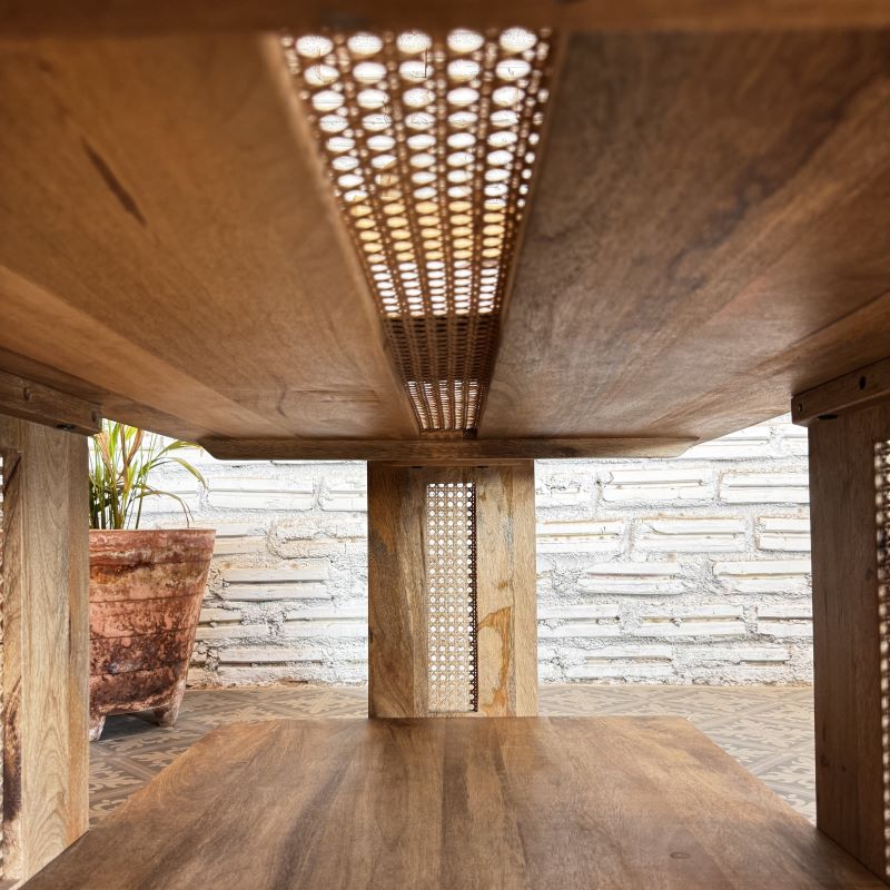 • Design: Rectangular planked top with natural wood grain; architectural open‑cube base with woven rattan cane panels in square frames; lower storage shelf