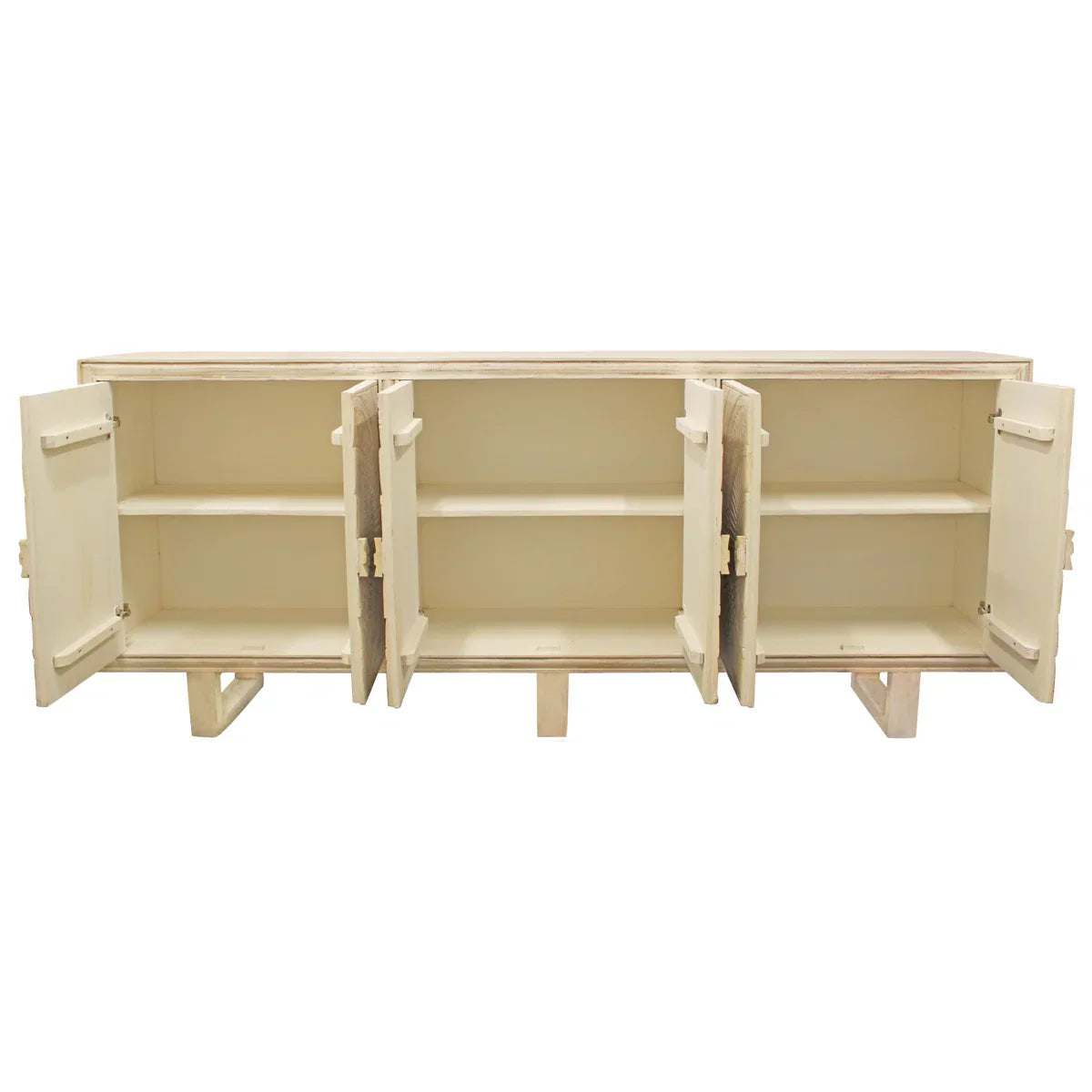 A handcrafted extra‑large sideboard in solid mango wood features six doors with stunning hand‑carved circular spiral medallion panels—each door showcasing intricate radiating geometric patterns carved in deep relief with concentric circles, radiating grooves, and starburst detailing that creates dramatic dimensional texture. The piece features a soft whitewashed finish that reveals warm wood undertones. Built with premium solid mango wood construction, the sideboard rests on modern sled‑style block feet. The 221 × 40 × 104 cm piece provides abundant storage through six cabinet doors with interior shelving, ideal for crockery, linens, books, or decorative accents. The carved circular medallions create a bold architectural statement while adding traditional Indian artistry. Perfect as statement cabinetry in living rooms, dining rooms, hallways, or behind sofas. Built with traditional Indian craftsmanship, this piece brings coastal bohemian, modern farmhouse, or Scandinavian charm to interiors—combining functional storage with ornate hand‑carved medallion artistry and elegant whitewashed finish.